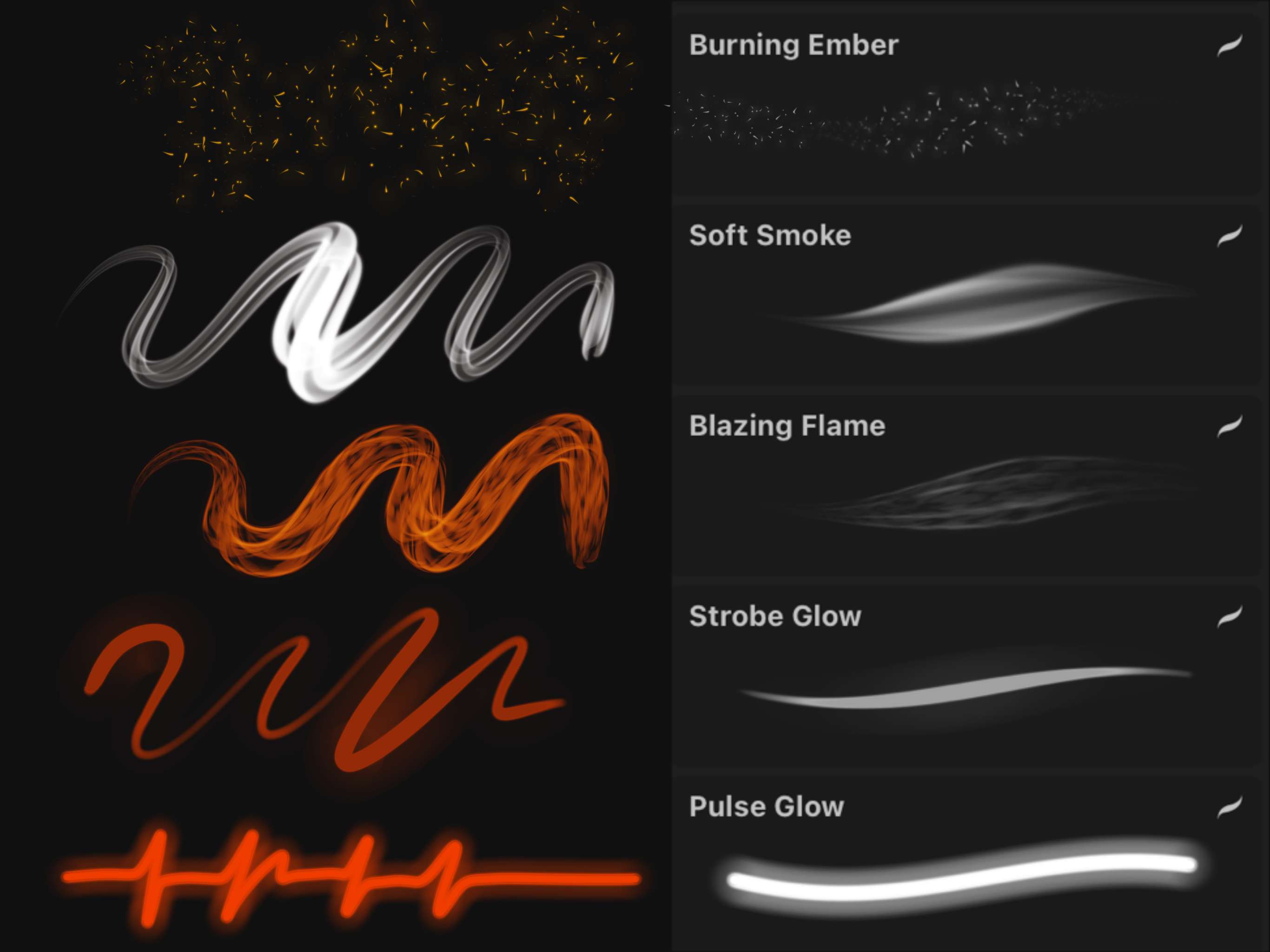 • 5 Fire & Smoke Brushes: Create realistic or stylized flames, embers, and drifting smoke.
